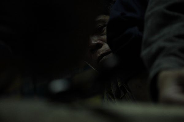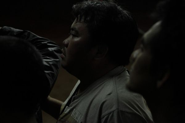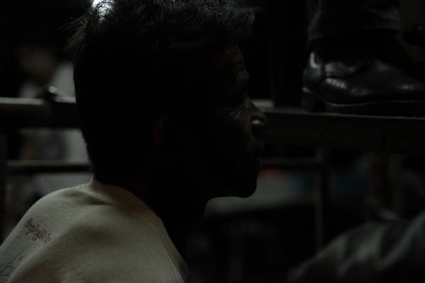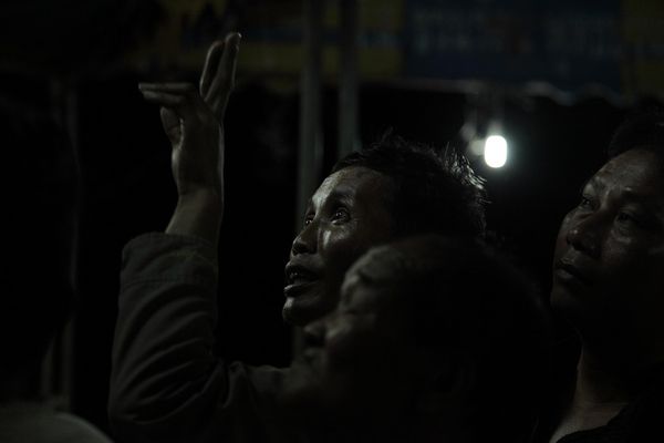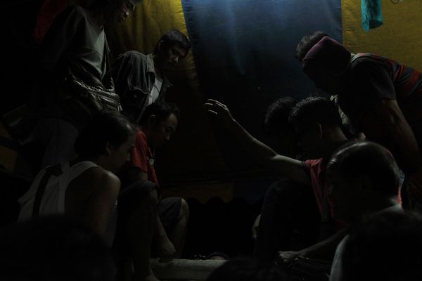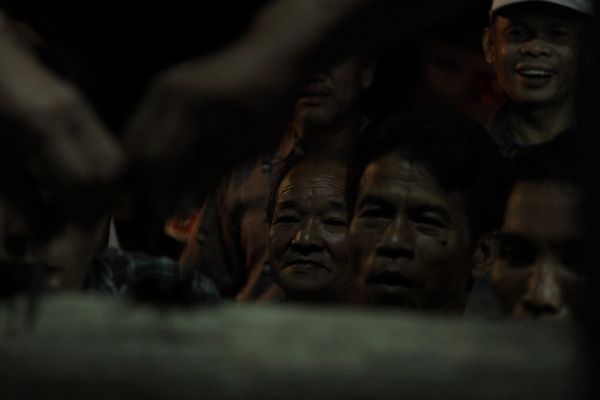 Gathered around a small metal stage, a group of men cajoles and shouts excitedly.