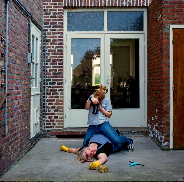 There lies her mother: washed up on the rocks by a river, in a strange position with eyes wide open on the floor of an empty room, on the hard concrete of a courtyard, with a head wound and wearing yellow rubber gloves. Her daughter is perched on top of the body, capturing the gruesome scene with a telephoto lens.