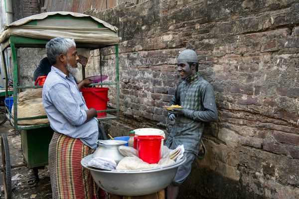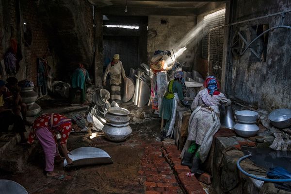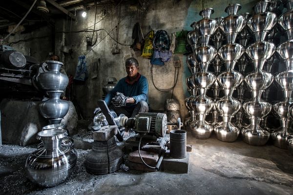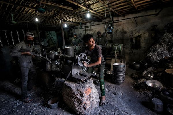 There are many aluminium factories in Bangladesh where different types of pots and pans are made from recycled and melted aluminium. To produce an aluminium pan, bowl, kettle or kettle, this aluminium must first be melted, transformed into ingots, rolled and then cut into discs. Then comes anodizing, a chemical process to prevent objects from rusting. The aluminium discs are dipped in sulphuric acid and then caustic soda. The work is dangerous and toxic. The discs are then formed with the force of the arms on rotating machines to obtain the kitchen utensils. The final touch is the sandpaper polishing that you attach to your hands and feet.