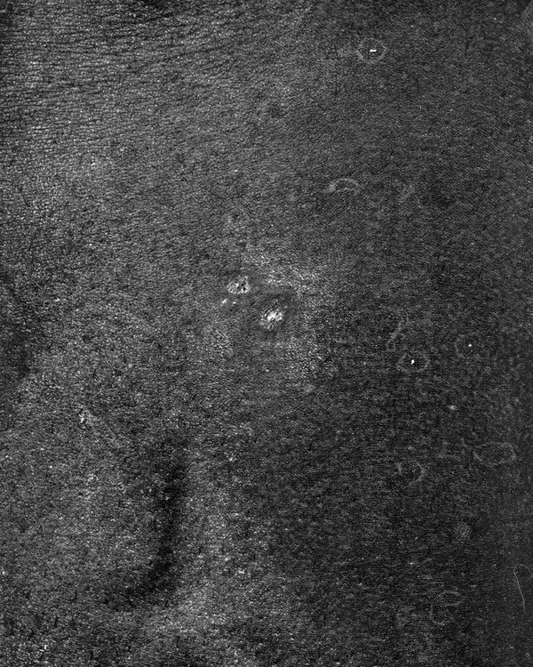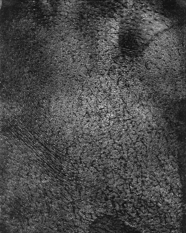 The anonymity of the bodies portrayed up close in imprints creates a unique archive of time and skin without the immediate context of identity. Each image is presented black and white to create an anonymous, embodied union of skin each with their own diverse background and physical presence. Enlarging each imprint to highlight textures, shapes, and repetitive patterns of hair, folds of skin, and scars compiles a collective record of the human body as vastly differentiated and intimately similar.