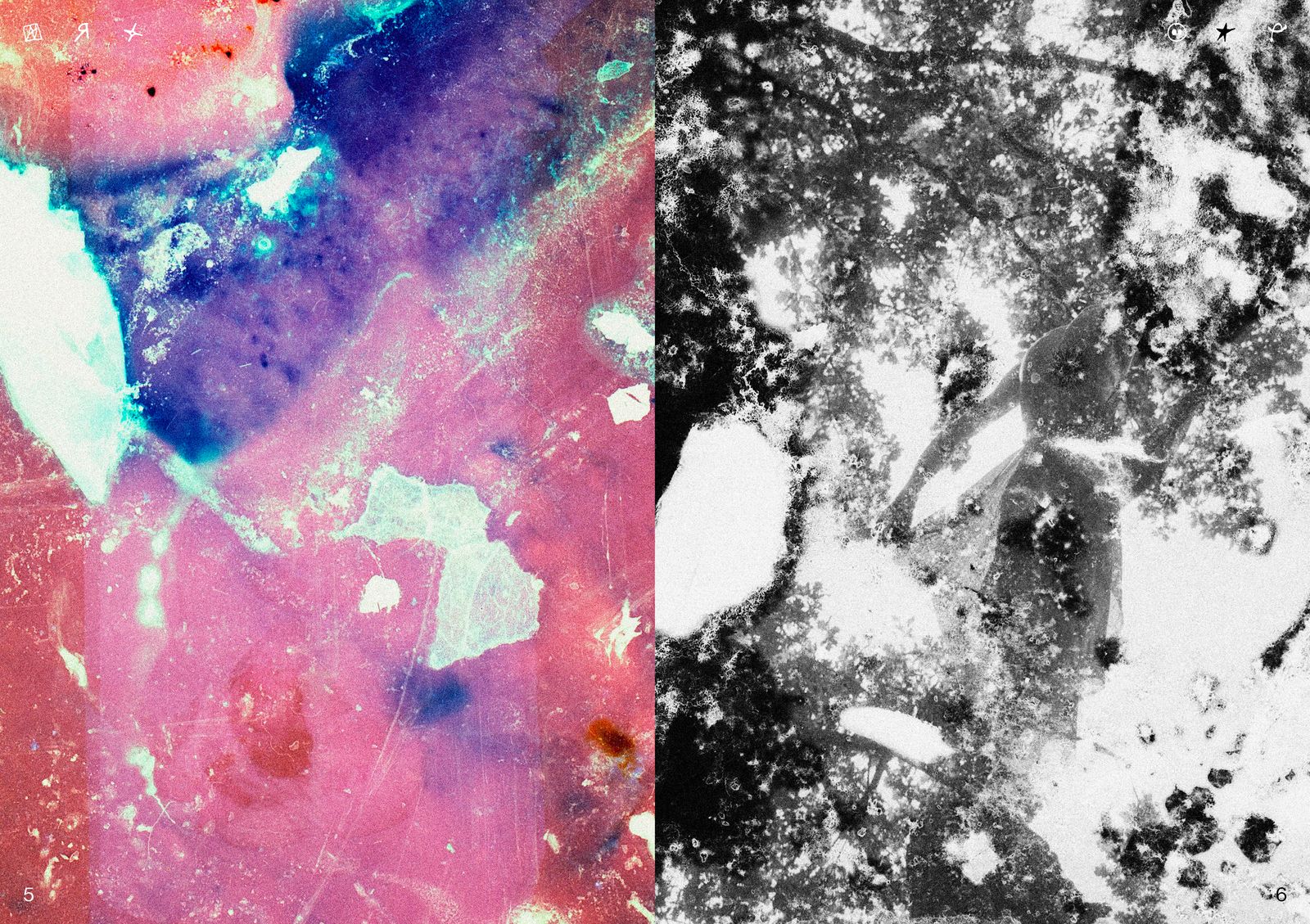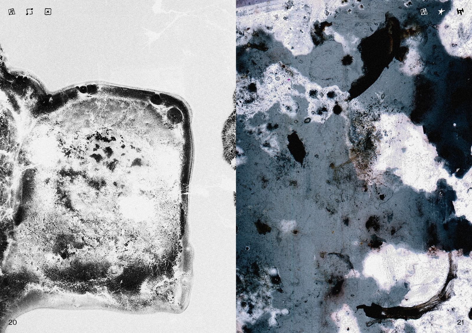 The images presented in this book are starkly different from conventional photographs. While photography has long pursued the goal of capturing and representing reality, no image can ever fully embody the reality it portrays. This quest for realism produces a paradoxical distance: the closer an image gets to the moment, the more its materiality recedes into the background. The demand for maximum realism becomes paramount, while the traces of the image’s becoming are concealed beneath a dome of supposed irrelevance. Retouching and digital editing attempt to erase the last signs of the image as a medium. The Symbols on the top corners of each Page are tied to an Atlas legend, which unbosoms the heritage of the change the Material witnessed. Germs and Organic Material were consciously bred in petri-dishes before the analogue material (negatives, slides, handprints) were exposed to them.