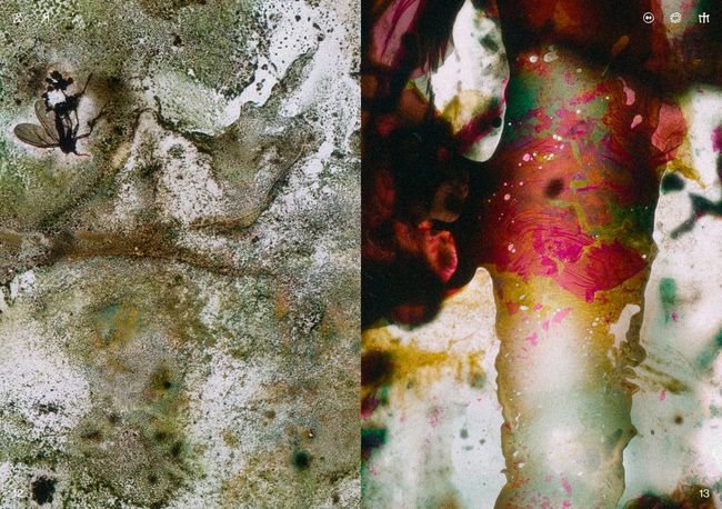 This photobook contains decayed/molded analog image carriers, the borderline of materiality and image is dissolved . It explores decay, transformation, and the physical reality of the medium, between light, chemistry, decomposition & emerging of new life.
