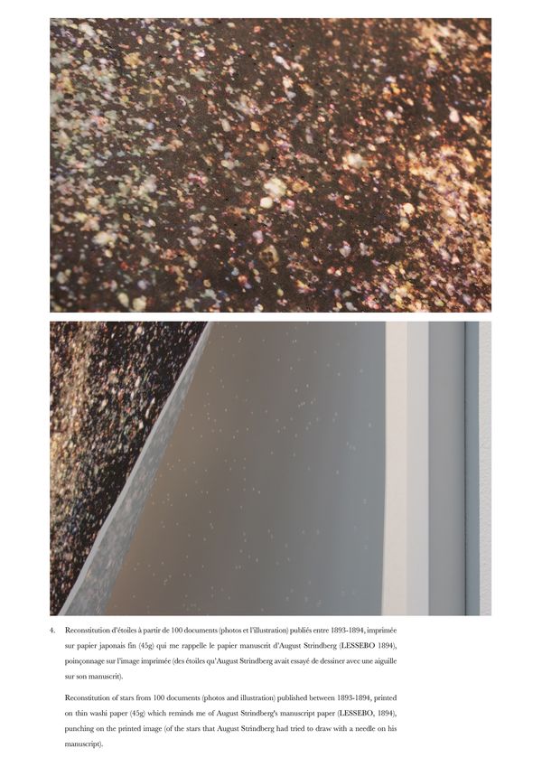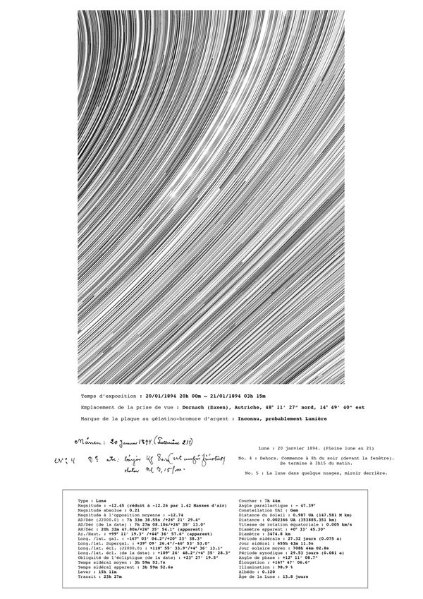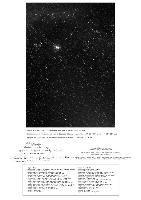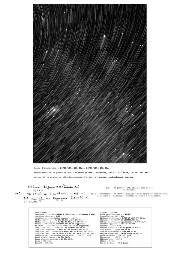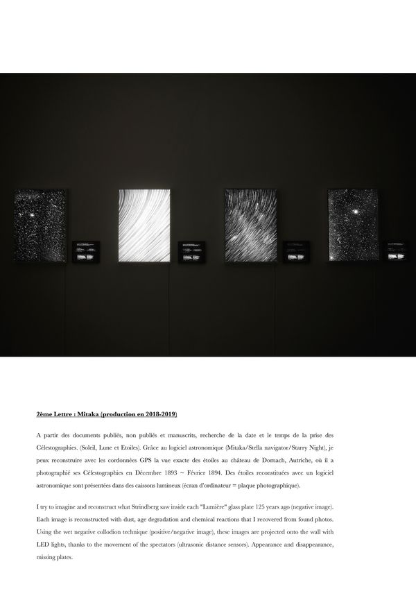 The Celestographs by Swedish playwright August Strindberg were produced at Dornach Castle in Saxen, Upper Austria in December 1893 – March 1894 during the period of industrialization and modernization at the dawn of the 20th century. The invention of gelatin dry plates greatly simplifies the shooting of images, allowing the development of new scientific techniques such as Astrophotography, Chronophotography, and Radiography. On the other hand, these scientific photographs were deeply linked to the occultism, resulting in the invention of Thoughtography by Louis Darget and photography of the soul by Dr.Hippolyte Baraduc. In other words, this is the period when photography became, in many ways, « the retina of the scientist, » as the French astronomer Jules Janssen says. More and more, a new and invisible world started to reveal in the form of a photographic image, changed our thinking about distance, simultaneity, time, sensoriality and memory. This revolution provoked unease, doubts but also raises hope in Strindberg and his contemporaries. Just like the telephone, the phonograph or even the cinema in their time have rewritten our perceptions and the use of our senses, which are today questioned again by the emergence of technological innovations.