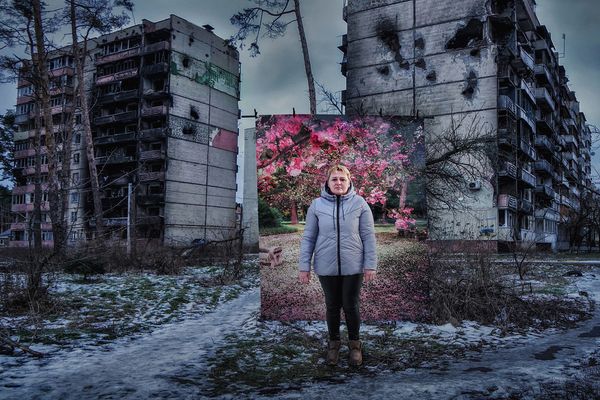 I live in Bucha and work in Irpin. After the Russian occupation, these cities were destroyed. The military landscape has become my reality and routine. Every day I see people who are restoring their cities, their personal lives from the ruins and looking into the future.I created a series of photographs in a historical dialogue with images by Polish photographer Michael Nash, who captured how the photographer used a decorative backdrop to mask the ruins of Warsaw during World War II in 1945-1946.The heroes of my photographs are women who became victims of Russian aggression. The occupation continued in the spring, people who survived this tragic period did not notice how spring passed, how chestnuts and lilies of the valley bloomed, birds flew in. They were deprived not only of their homes, loved ones, work, health, but also part of their lives. IDPs from Donbass and Crimea have a second tragic spring. A stolen spring is a stolen life. Each photo is a personal tragedy, but it is also a life-affirming story of a survivor, a hope that Ukraine will rise from the ruins.