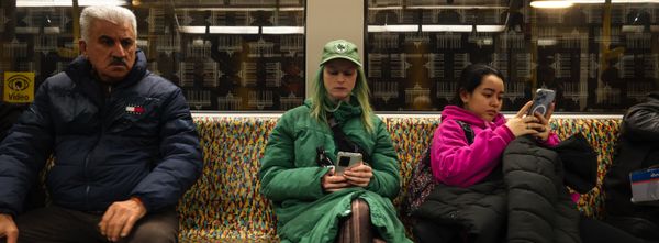 We usually cling to our phones the minute we have some time off, so it’s rare to see someone who isn’t scrolling in subway cars. That’s why I think the most interesting moments in the series pop when people are doing something else: a man with the thumb on the screen but looking straight at the photographer; a man apparently in pain in the center of the frame, surrounded by people minding their own business; two guys laughing at each other; a woman with a fox purse looking out the window.