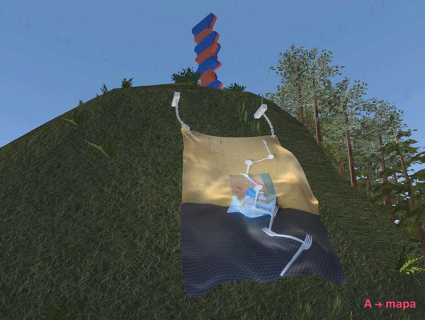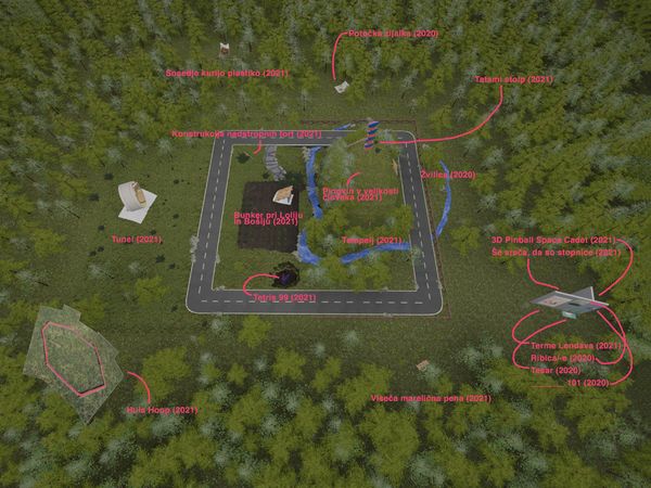 In addition to the photographic compositions through which Rosc builds her recognisable aesthetic, the exhibition Superpositions focuses more than ever on the concept of memory and the creation of fictional narratives. In the video game Udén,[1] the setting of her childhood is her grandparents’ field in the Upper Savinja Valley, which they have rented since before she was born. The staging of her past is literally interwoven with her current artwork, as photographs and objects appear in the space of the virtual field as giant coordinate points, and a walk through the virtual world is reminiscent of a psychedelic march through the artist’s subconscious. New works are deposited as old memories, interrupting the peaceful space of the family field in a dizzying version of a “virtual exhibition”. Rosc uses a mixture of realities to represent a child’s view of the world, combining multiple layers of her own memory, which is inherently unreliable and biased. The space where she spent so much time as a child thus becomes a scene of play with distortions, where the viewer enters the artist’s construction of her own memory.