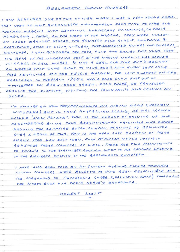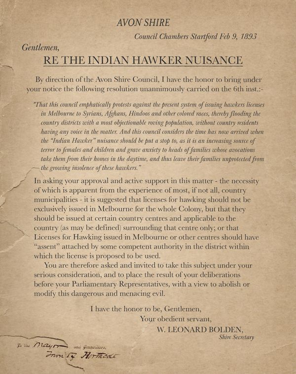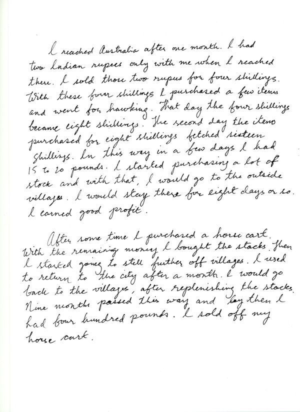 The purpose of the work is not to create a definitive reinterpretation of existing histories of the men who worked as hawkers. Instead I attempt to adopt a methodology that combines the study of existing subjective South Asian histories in Australia with visually based production and recovery that creates meaning, and offers a historically orientated socio-political narrative concerning specific race relations in the late 19th and early 20th centuries within colonial Australia.