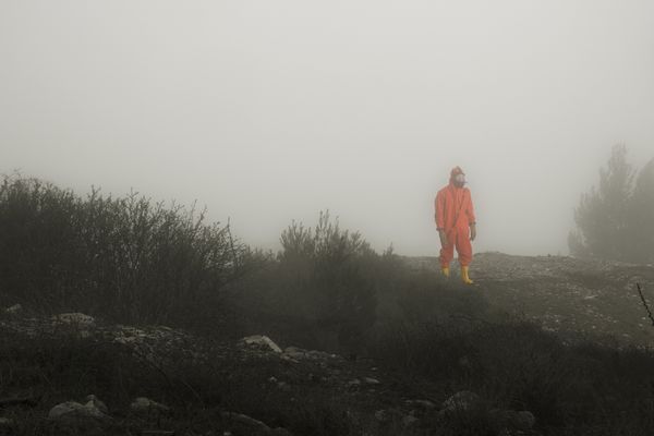 Thus, the protagonist appears as a blanket man with a non specified identity- the unique and lonely wanderer in an uncanny scenery. He is the flâneur of a whole new era; awkward, dazzled and confused, he is searching for ways to adjust in the inhospitable, hostile environment. Wearing the protection uniform and isolated in his own “heavy” existence, he tries to decode and reconfigure a post apocalyptic surrounding space.