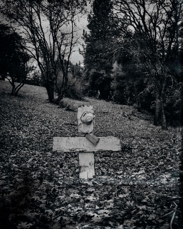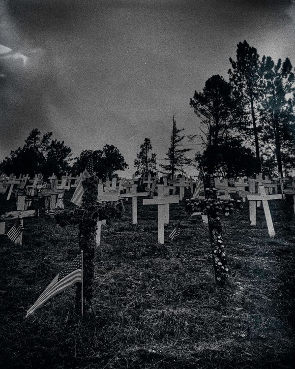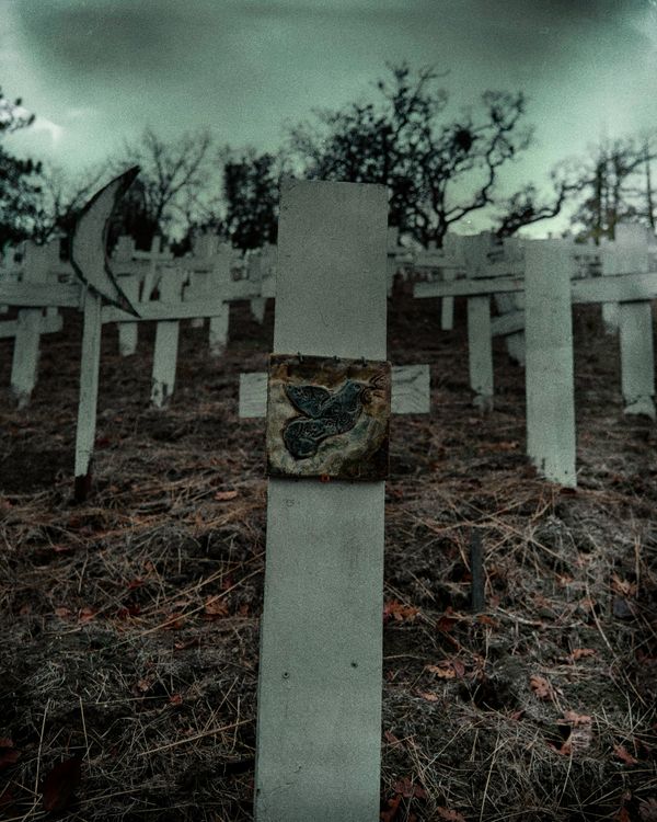 It is the directed reality environment project. Most of the crosses were in that location but I staged and added more elements like the hanged mask on the single cross. Photos telling the narrative of the darkness of the war. All the grains are added in post-production to shows the mood and the loneliness. The loneliness that I experienced after losing some of my family members and friends.