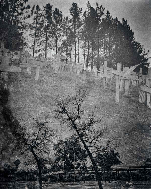I come from a country that unfortunately has eight years of war in its record. Much of my childhood was spent in the war with bombs, poverty, and seeing the martyrdom of innocent Iranians. The bitter experiences of war still linger in me. About two years ago, on my way to Walnut Creek, I came across a view of the Crosses of Lafayette, a memorial to the Iraq war. The idea of this collection was like a fetus from that time until recently in my mind. The dark living conditions and seeing the people who die every day because of Covid 19 caused these photos to be born.