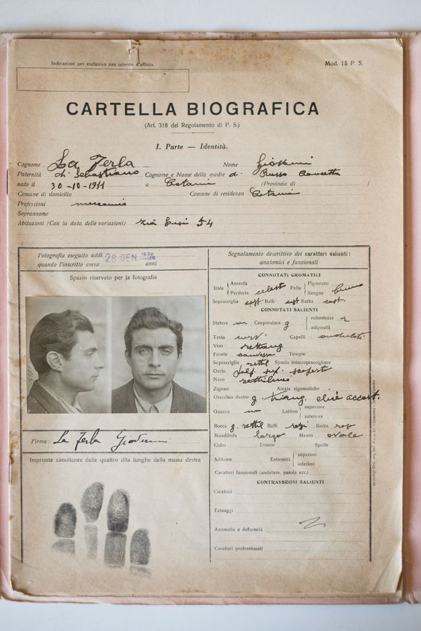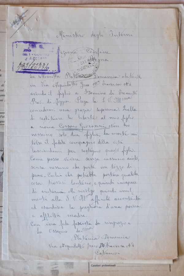 In my research I tried to photographically reconstruct the places where these “arrusi” met in Catania before the arrests, and the places of confinement on the island of San Domino. The biographical files, the documents regarding arrests, medical examinations and supplications were photographed at the State Archive in Rome.