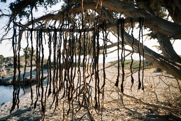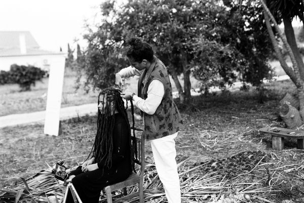 The severance of Shuba's physical connection occurred during a durational performance symbolizing the ritual act of collective haircutting. This act actualized a process of identity death and the release of a reality mediated by the veil of knotted hair. The performance unfolded amidst the yucca tree, magnolia grandiflora, and carob tree, near the old pines by the entrance to the field. The site held additional significance, as two cats—one pregnant and the other, Gata, a feline companion to many artists at The Plot in Azeitão, Portugal—had been buried there.