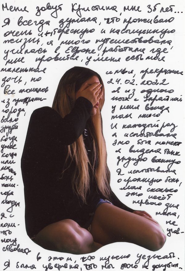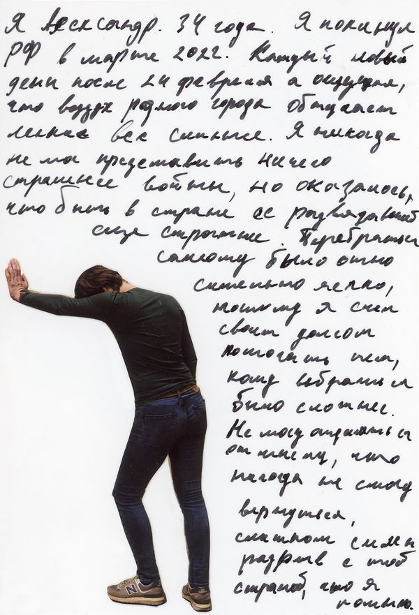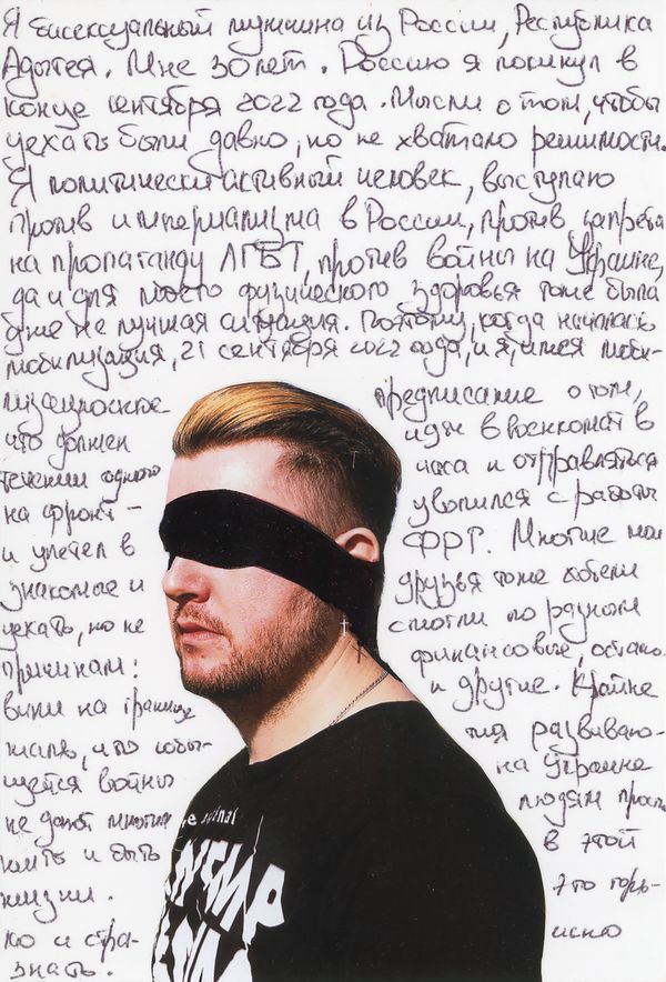 They include activists and people from the LGBTQ+ community who, following the tightening of the law against homosexual propaganda, were no longer safe in their own country. I decided to have them tell their stories by their own hand, writing them on the photos. Some of them preferred not to do so because of the difficulty of summarizing in a few lines the complexity of their thoughts about this tragic page of world history and their own condition.