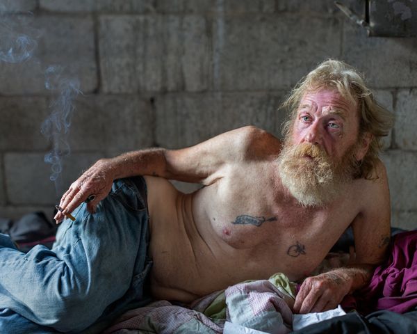 The Drake offers a means to delve deeply into a world far removed from my own but also perilously close — how my life might have looked had I not found the resources that led me to recovery. The work continuously challenges my concept of empathy and how to photograph my subjects in such a way as to “make the unseen seen.”1 I am passionate in my intent to push back against a society of increasing culturally endorsed behavior to not acknowledge the marginalized. These are not easy pictures, but my hope is that the images give space for viewers to move closer, to enter the stillness of the photographs and consider the lives of those looking back.