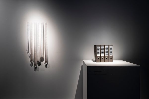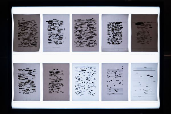 50 x A4 redacted and blanked academic papers on tracing paper, commercial lightboxes, matte backlit paper