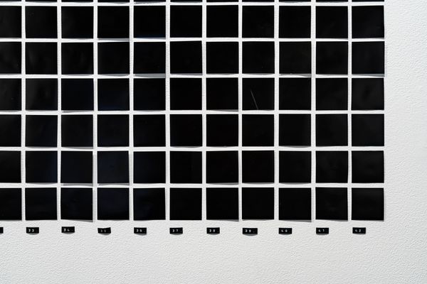 1050 squares of exposed and developed black and white photographic paper, embossed labels