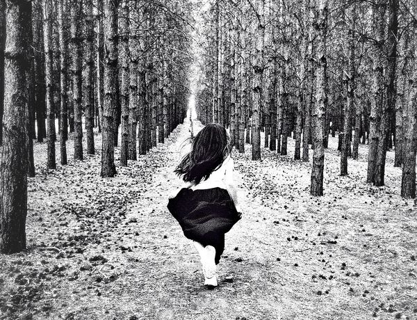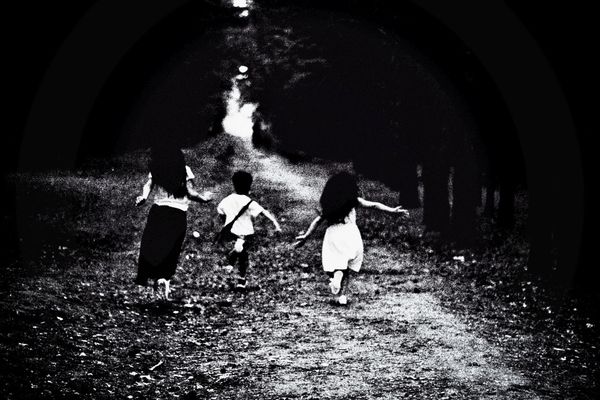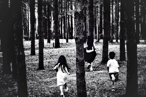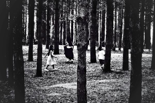 Children run through the forest as if following an invisible path. Between light and shadow, the woods become a place of memory where childhood appears fragile, mysterious and fleeting.