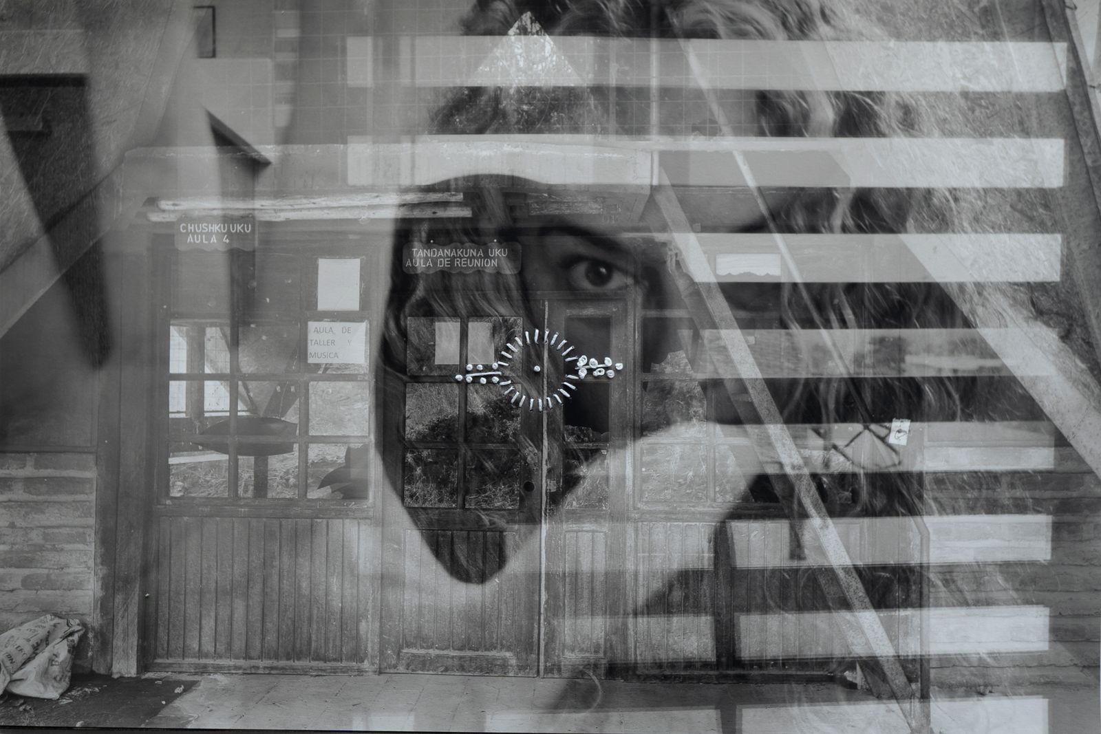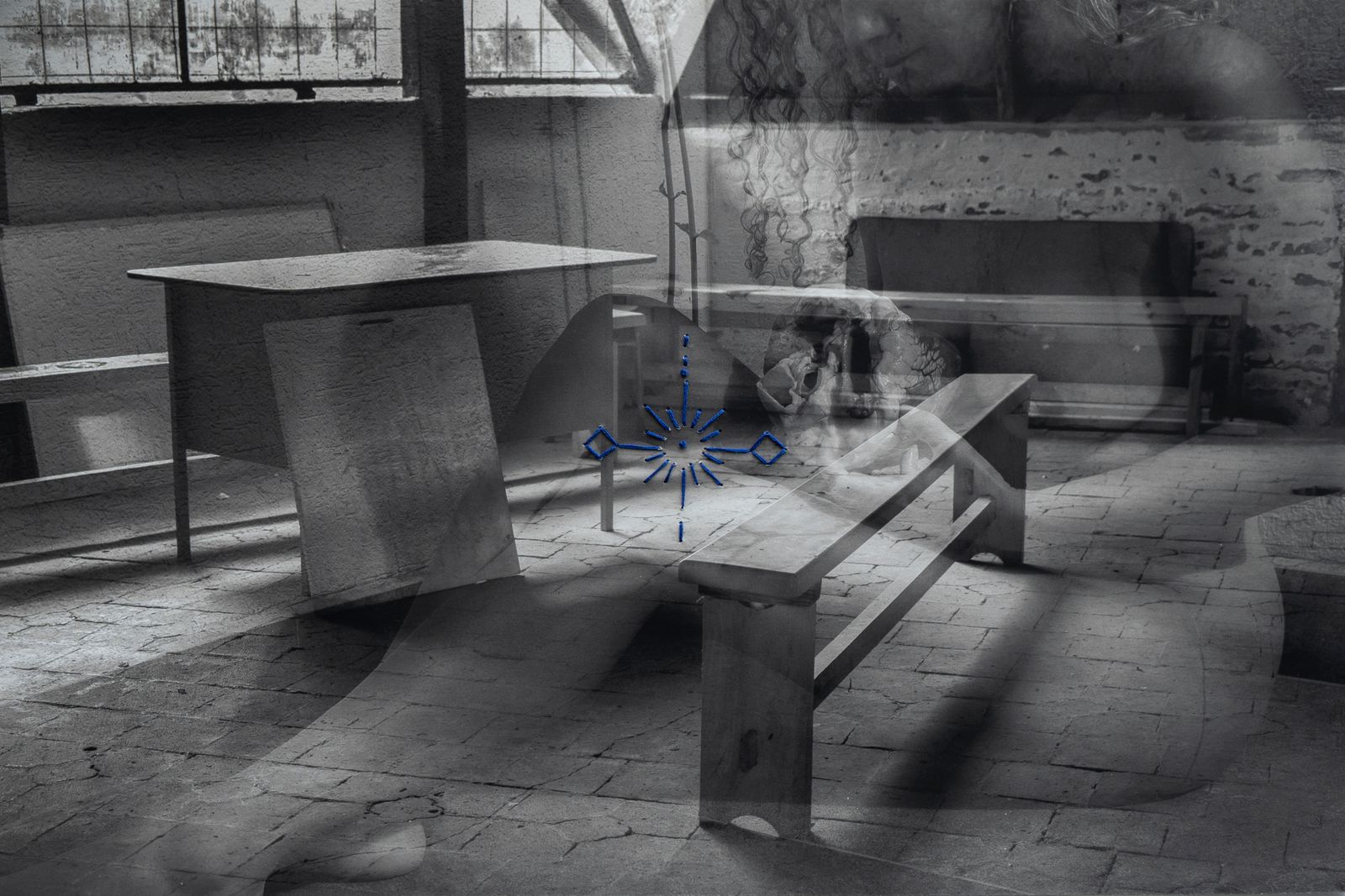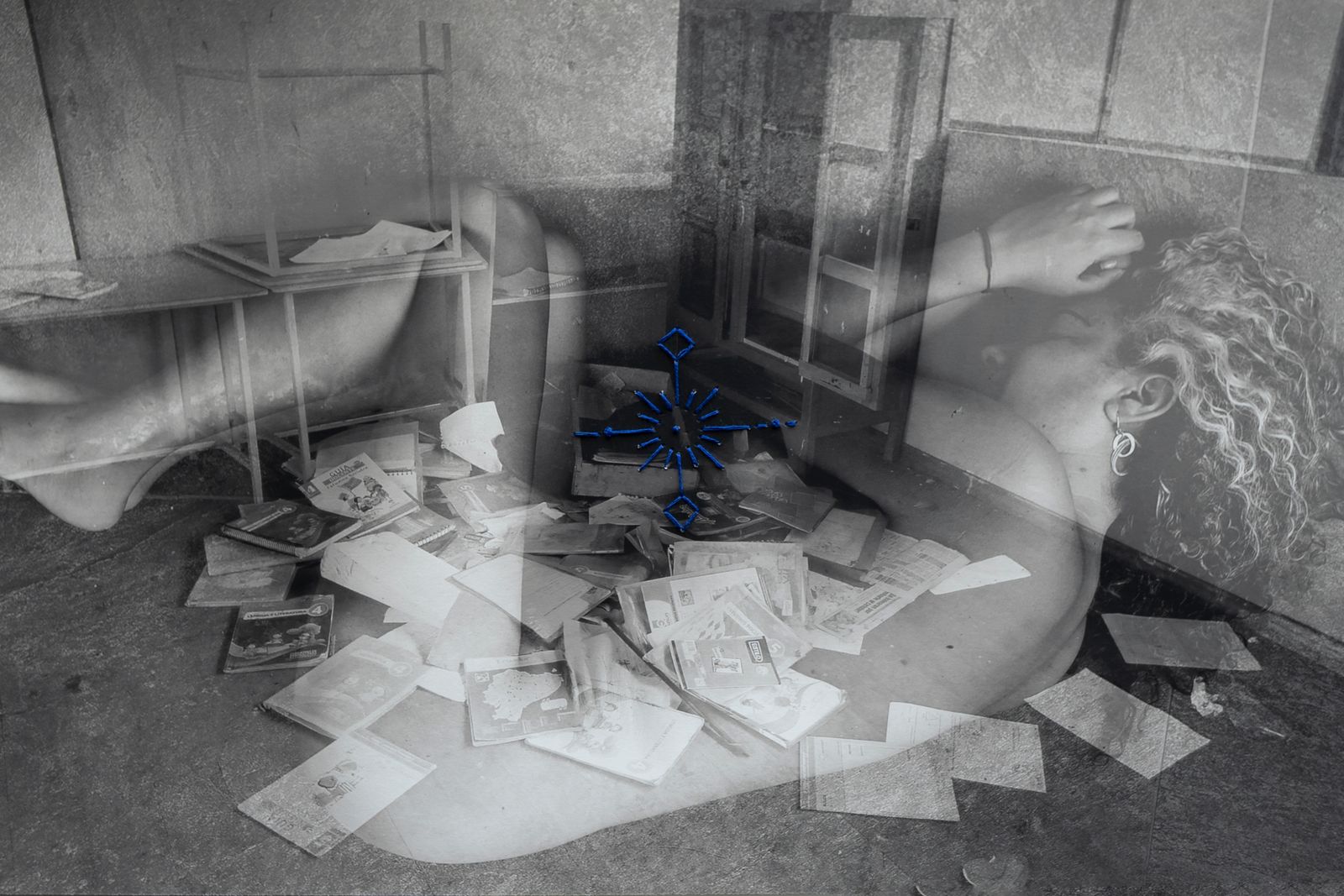 This photographic series represents the empty space of community schools, fused with the empty space of my naked body, crossed by the symbols of the chacana, Andean symbol of the relationship of the relationality of the whole.