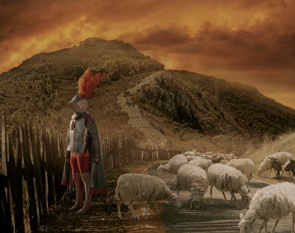 Ansel Adam's early landscape photography. In one of the works a knight in full