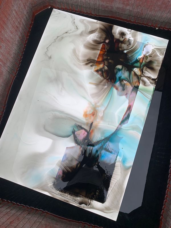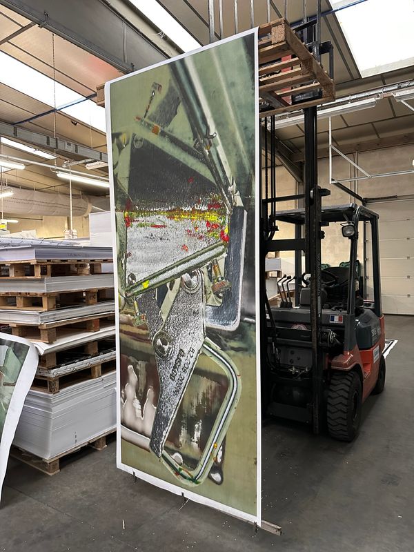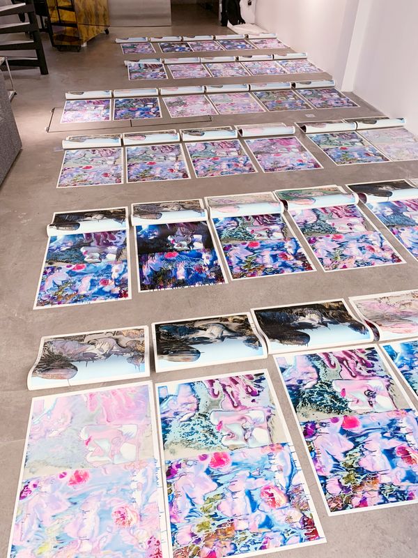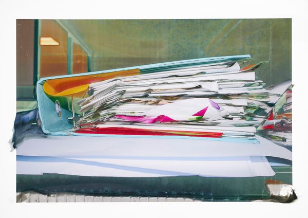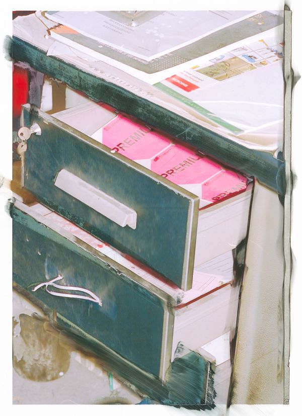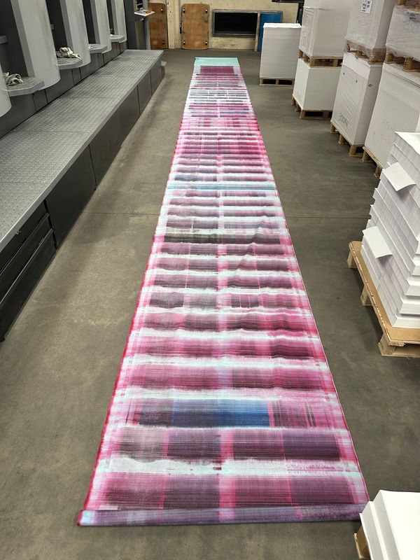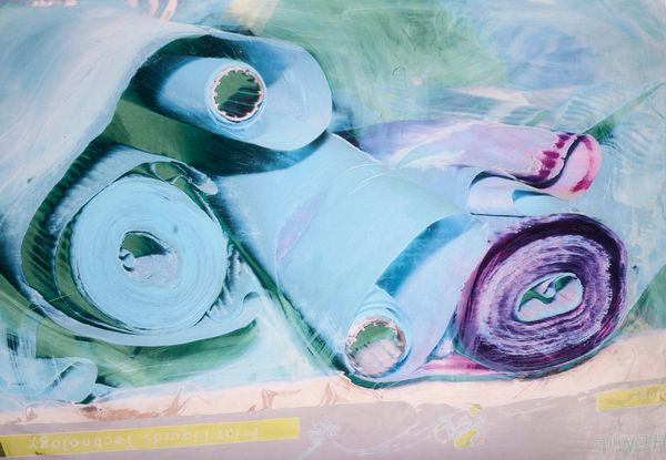 Whether analog or digital, my photographs are scanned or de-rushed before being printed on fiberless, waterproof, thick plastic materials commonly used in offset lithography. Here, the ink is projected out of the machine onto the paper roll without completely being embedded in it. When obtained, the image is in an inchoative state: it is still alive, moving, somewhat organic. It’s also extremely sensitive to touch. I started playing around with this breathing material; I was curious to see how I could still be involved in its life cycle. From coating or sweeping to blow drying, I investigated a wide range of techniques, all of which produce specific and peculiar effects. These experiments were enabled by my personal background: my family owns a printing factory in the Auvergne-Rhône-Alpes region, which has been passed down four generations. Thanks to this, I had access to the resources these tryouts required. I also felt comfortable handling the machines, messing around with them, tormenting them a little at times; they were familiar tools I already shared some sort of intimacy with. This importance of this space was heightened by it becoming the very subject of my photographs. I started documenting the factory, but rather than photographing its workers  – in this case, my family members – I focused on the horde of engines, details and non-human entities populating this industrial organism. From the graphic designers’ office desks to the outdoor delivery system, I wanted to show the physical spaces through which images transit; where they are produced and disseminated, following the rhythm of daily orders. The angle and lens left aside, nothing in this series is staged: what we have is the location in its most neutral form, stripped-down, bare-naked.