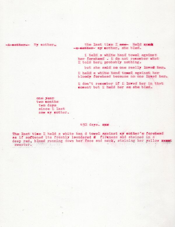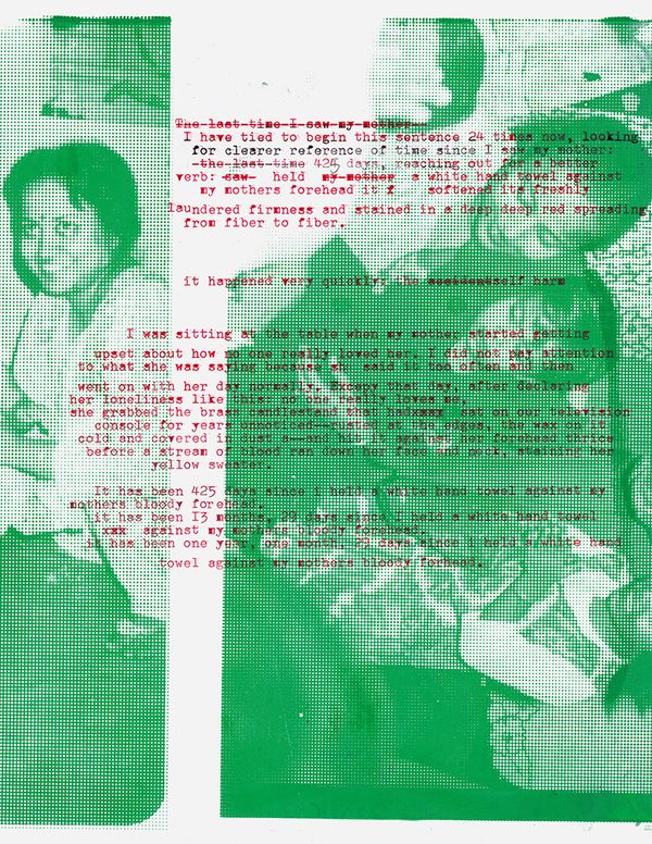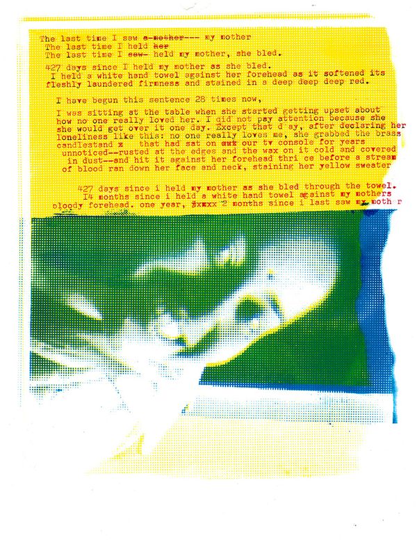 In this project, I examine and engage with my mother’s presence in my family albums. Family albums—a primary instrument of self-knowledge and representation—traditionally celebrate success, leaving out depictions of tragedy and mourning from family life. I recollect memories of my last day at home with my mother before moving to New York more than two years ago when she, overcome by mania, self-harmed in front of me. Through the uncanny juxtaposition of photographs from my mother’s life and writing, the project brings forth the complications of a mother-daughter relationship, while the use of time, repetition, and revision becomes a way of forgetting and healing.