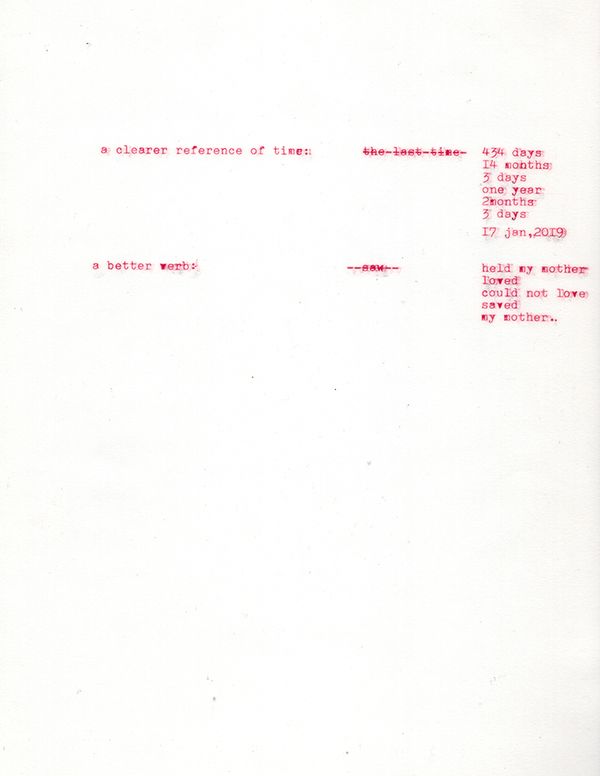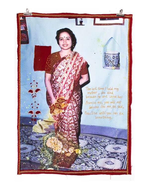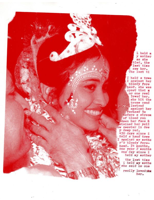 The Last Time is an exploration of my origin and inheritance, which is embedded in the figure of my mother. It deals with memory, mental illness, transgenerational trauma, and how they inform identity using mediums such as photography, text, printmaking, and embroidery. My work functions as a counter-archive that seeks to repair histories of trauma, articulating possibilities for pleasure under conditions of abjection.