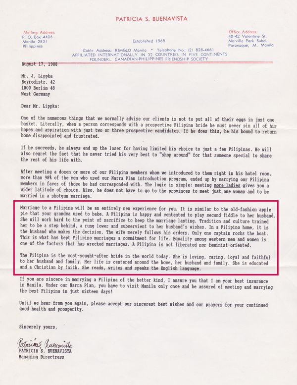 Based on a find of a garden house with letters from Filippinas willing to marry to a Berlin bachelor in the 1980s, she sets out on a search; for the authors and the recipient, for love and for truths in these alliances, which at first seem to be based solely on mutual exploitation.