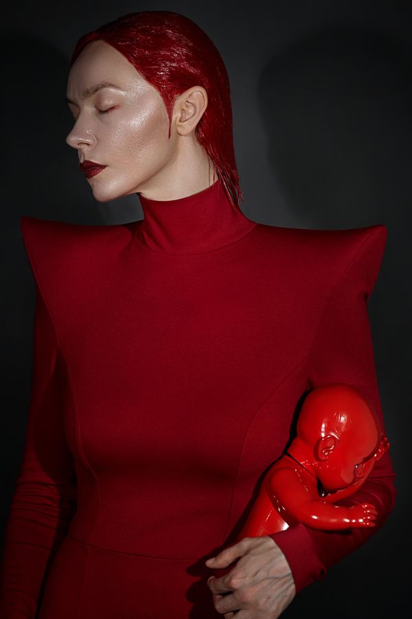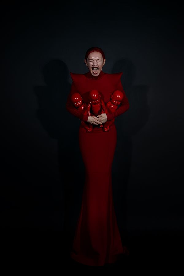 motherhood, protection, scream, children, instinct, red, sacred force, emotional art, dark photography, conceptual, feminine energy, visual metaphor, shield, silence, strength
