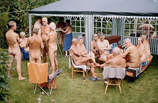 At first glance, my photographs show the hikers wandering through the woods, hanging at garden parties, sitting by a fireplace or partaking in a bowling night - all of which, undressed. Nakedness here seems partly natural, emanates special intimacy or stands oddly out of place. Whether we are in an indoor or an outdoor space further plays a special role. Nudity usually takes place in a private environment or designated places. The naturists revolt against this very social prohibition and wander in public forests. Though nudity is present in all corners of media around us, the society is evolving from the liberation spirit of the ‘68, in a different direction. Nudity does not seem to be understood as much as it once was as a protest. Media influences and prevailing beauty ideals play a major role behind. Naturists’ actions speak of a yearning for the contact with nature, a break from our technological and digital world. Many longed for this touch even as a child. Man in nature as a romantic picture of our origin. But it is also a protest, against the more dusty nudist clubs blatantly vying for new members, and our conservative society. Nudity should not be banned, but the fence that surrounds the club embodies that. However, the contact with nature never takes place directly, even when they are sitting, there is a towel between the skin and the ground.