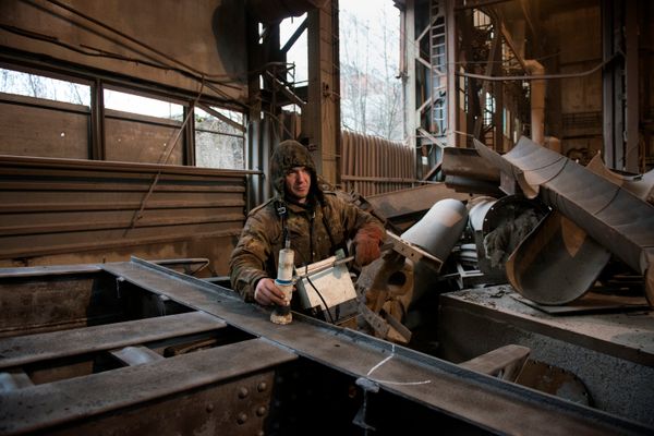 The workshop is a huge warehouse where 12 men clean and recycle radioactive metals. His company recycles about 30 tons of metal a year.