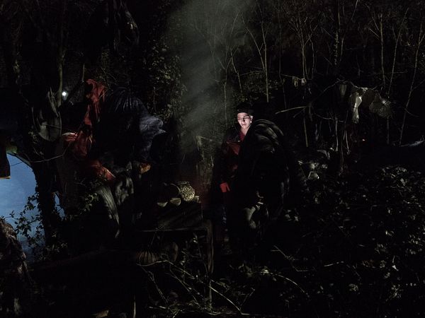 In May I found myself in Idomeni , the last Greek village before the borders with FYROM. There, I was to meet a group of refugees. They would attempt to cross over to FYROM overnight and head to Northern Europe from there. They hold pieces of wood for protection. Three days earlier traffickers had stabbed some other refugees who refused to pay them. They explain that they can see the passages from the GPS and they have no need for traffickers.