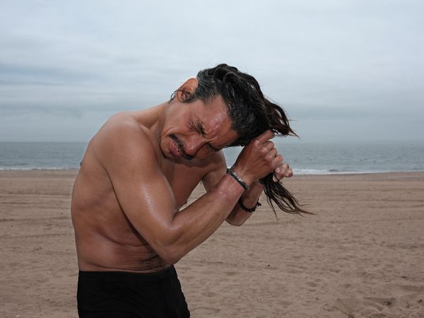 Referring to the beach as his humble abode, Aseed has lived there since the start of the pandemic. "I was born on a navy ship to a Mongolian-Japanese mom and a Portuguese-Saudi Arabian dad. So the sea is my home." Aseed served most of his life as a Navy SEAL, which gave him the survival skills to live outside year-round. "Having no comfort is comforting," he tells me, sitting in the snow. “These seven layers of clothing are my house: they shelter me from the malice intent in the world.”