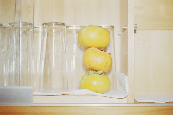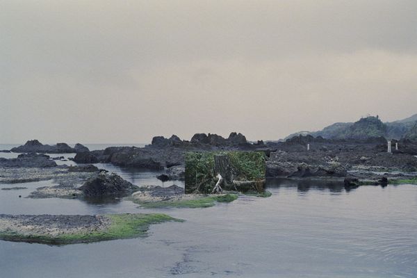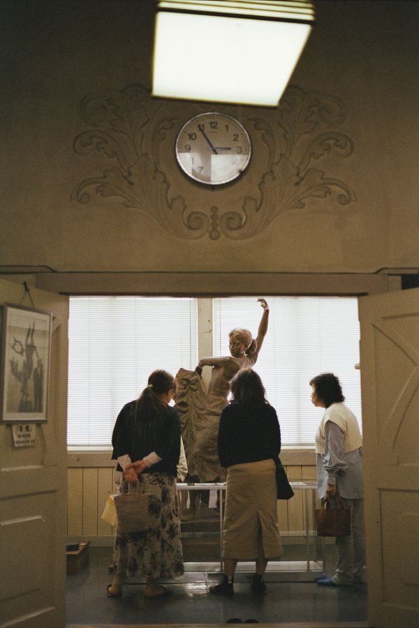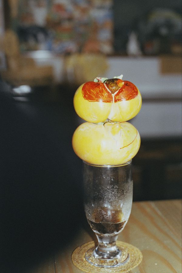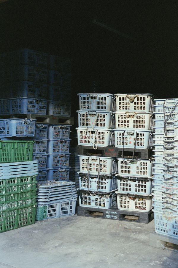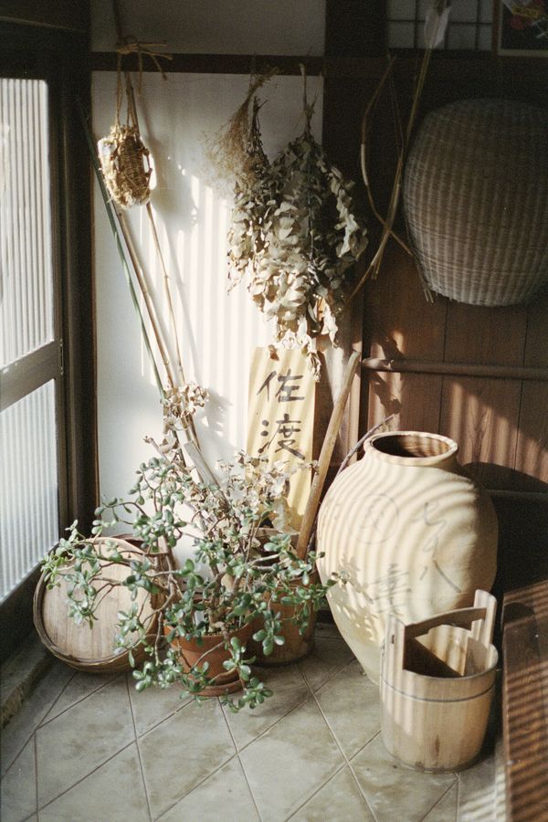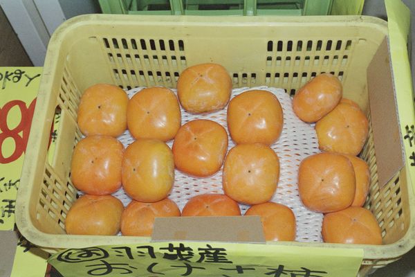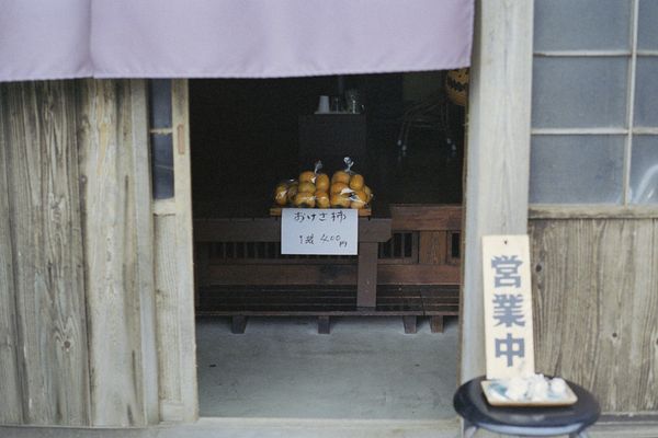 The Soil Remembers is a series of analogue photographs made on Sado in October 2025. It does not document the toki directly. Instead, it attends to the conditions that make the bird's survival possible: pesticide-free fields, okesa persimmons sold from wooden stalls, garlic hung to dry, produce moving through kitchens and daily life — all governed by an island-wide commitment to farming without chemical harm, so that the water remains clean enough for the ibis to feed in.