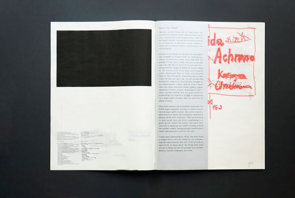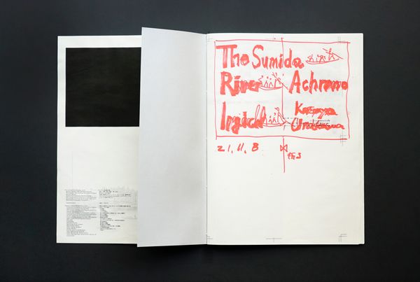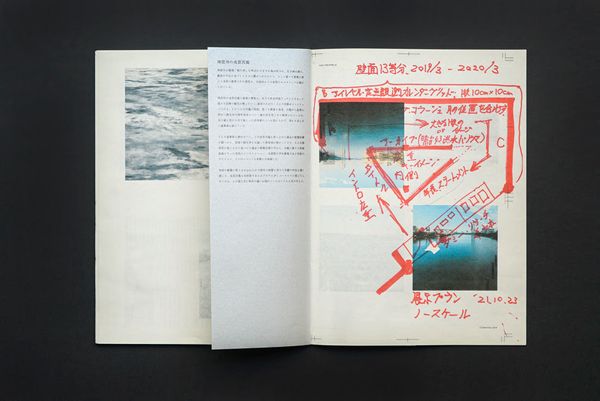 The image of the Sumida River, taken from a fixed observation point, depicts the same location as Hiroshige Utagawa's “Toto meisho zue Sumida-gawa watashi no zu (Famous Places in the Eastern Capital: A Picture of Sumida River Ferry)”. And the historical archive images are stored on a fold-out page and presented in panoramic format. In contrast, The Draft contains production notes and ten essays about the Sumida River, serving as a 'making of' companion to this work.
