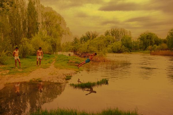 Youth appears in the series as both fall and ascent, loss and gain: bodies leaping into water, feet stepping onto mud, fleeting eye contact... All of these gestures carry the ephemeral yet intense imprints of desires and relationships. The pastoral image fragmented by digital distortions, reflections and shades of yellow, summons the fragility of memory into the here and now.