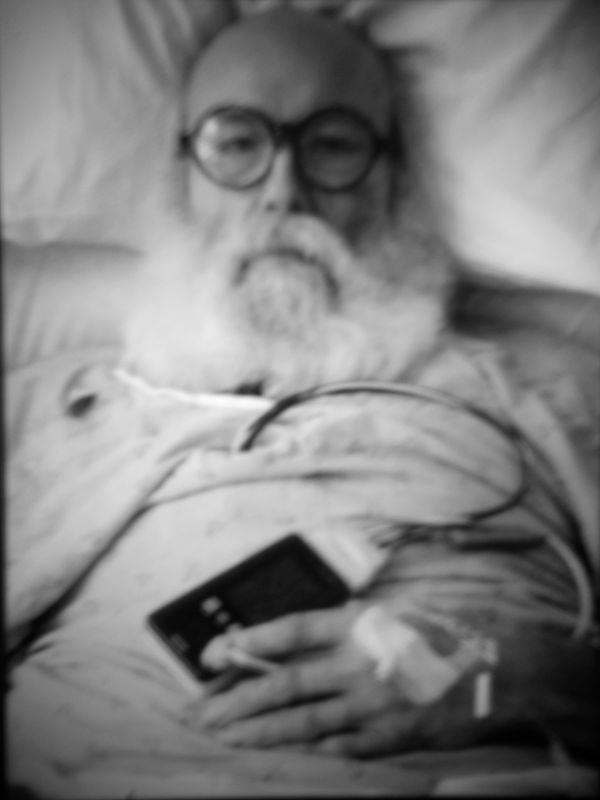 These photographs are a diary of my husband's and my journey as I lived in his hospital room to help care for him over the course of a year and a half and continue to be his caregiver at home. His heart was damaged in a nine-hour surgery and less than a month later he was trapped in a dark world of screaming brutal pain and hallucinations. This great storm was brought on by a bacterial infection that curled around his body, hid at times, and disabled his body viciously. When he woke up from the second operation there were tubes everywhere. They seemed to converge in a tangle at his hand. Tape and dried blood held them together. How could these transparent tentacles hold him so surely? Then he looked through them and saw me, smiling. I touched his cheek and the octopus disappeared and left him floating in a green web of reeds in the Sargasso Sea. Our lives were not destroyed but it changed forever how we walk in the world. Concentrating on photography provides a way to protect my sanity through this lengthy ordeal.