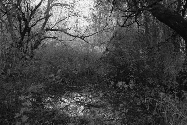 Walking the creek repeatedly across seasons, I photograph sites where past and present converge: remnants of earlier ecosystems, traces of human passage, and spaces that oscillate between domestication and wildness. Rather than illustrating history directly, the work approaches the landscape as a psychological terrain shaped by ambition, grief, displacement, and adaptation.