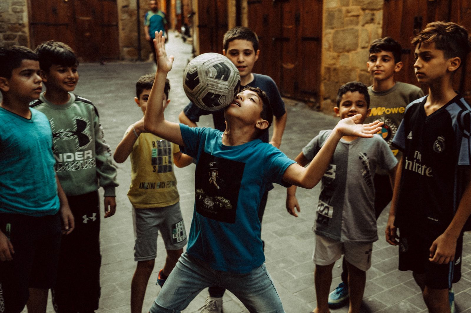 Children playing football in Sidon City old souk a fleeting moment of joy, prayer, and play as the ball descends toward a boy’s cheek. Lebanon, 2023.