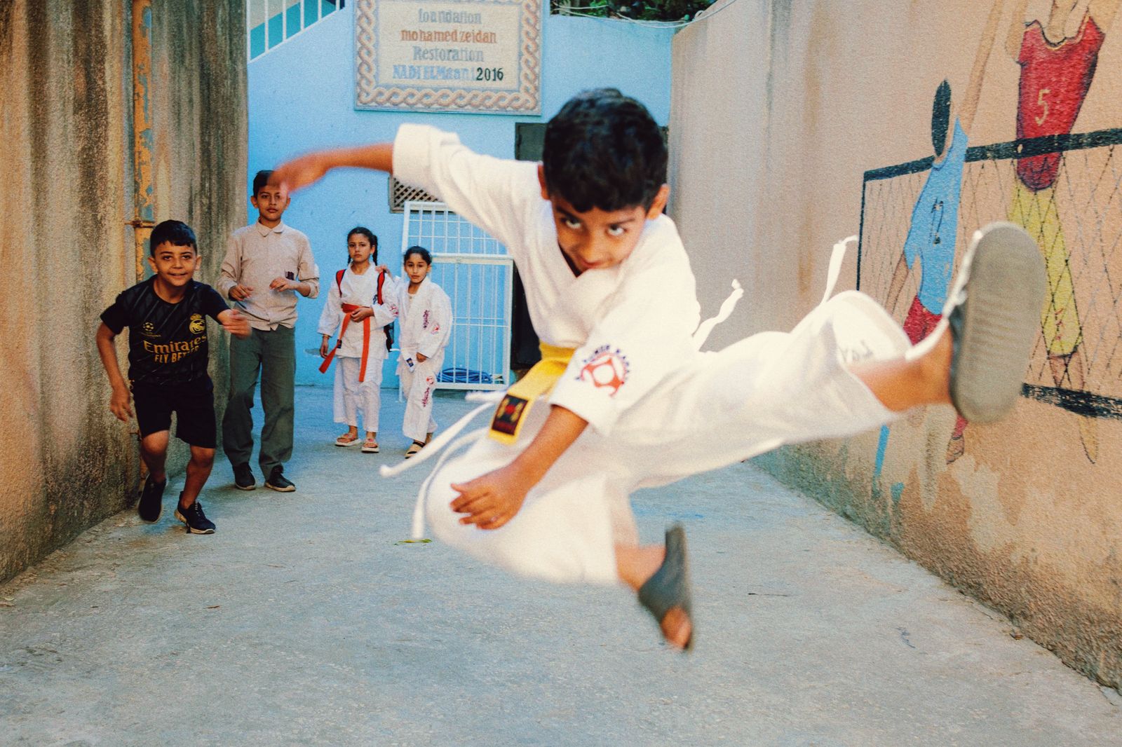 © Habib Saleh - A young kid is jumping off the ground, showing off his karate skills. Sidon City, Lebanon 2024.