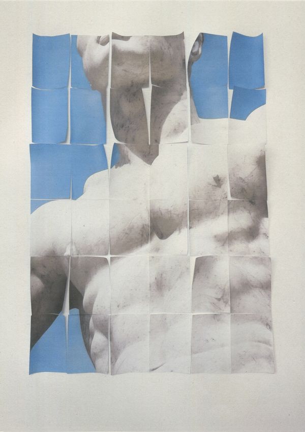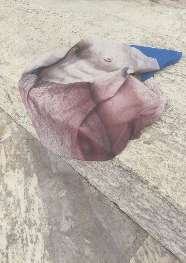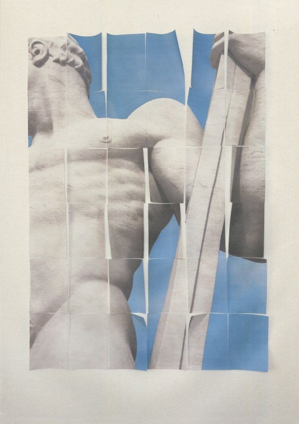The project unfolds primarily through collage, combining archival imagery with original photography. Raffaele incorporates elements such as the Foro’s statues, historical images, scanned photographs printed on recycled paper and fabrics, layering them with digital fragments, screenshots from dating apps, and portraits of queer bodies. The resulting compositions are simultaneously intimate and political.