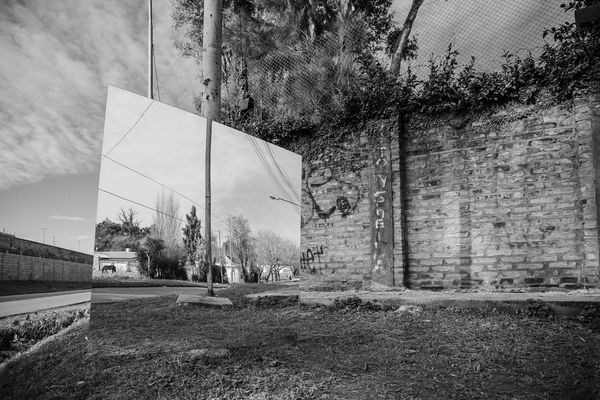 The appearance of gated communities on the outskirts of the Buenos Aires constitutes an urban phenomenon of great relevance. I photograph their walls as geographic landforms. Frontiers that separate private properties and ranks of neighbours that roughly alter the urban landscape and rules in a radical way. Though walls express themselves in different typologies leaving traces of what they hide or expose, patterns emerge in the uniformity where everything is alike in its differences. From which side I stand, the way of perceiving the world changes through a play of realities between surfaces. While walking through the outside it feels the friction of the inflicted boundary, considering not only the causes that gave origin to it, but the consequences in terms of the social fabric, and I wonder how far we are prisoners of our own beliefs. I remark the interaction between the wall and the context through a mirror that reflects what remains outside. The mirror contains the other dimension, which the wall conceals.
