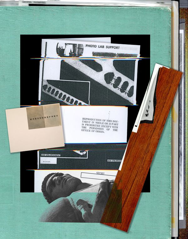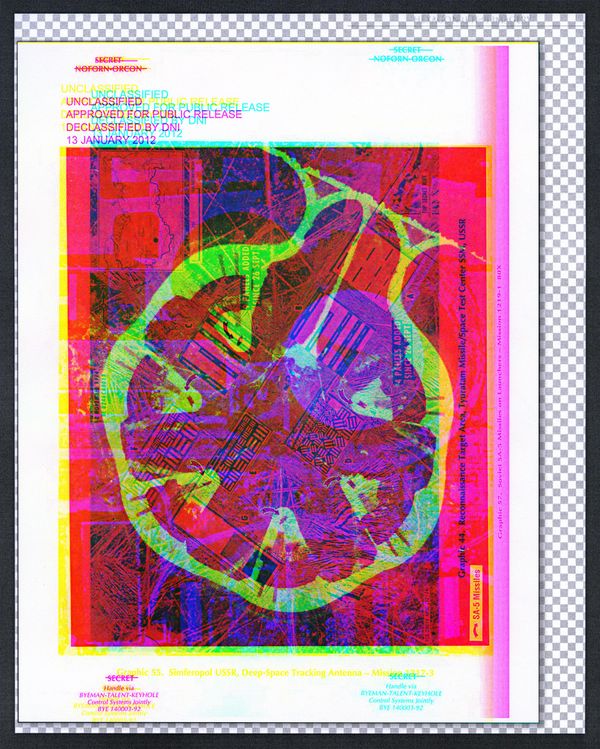 The source images that make up the pictures in Viewing Distance provide a distorted and fragmented archival glimpse of photography in the service of US imperium. While many of the images date back to the mid-twentieth century, they have only recently been declassified and much information remains secret. These pictures represent the decades-long time delay from when knowledge comes into being and when it becomes publicly accessible. Viewing Distance combines photographs pertaining to Cold War developments in photographic technologies with contemporary documents and devices, connecting past and present with implications for the future. Processes including analog printing, digital collage, scanner manipulation, and data bending are used to animate the archival material as well as emphasize the tension between informational and enigmatic source images. Through these interventions, historical fragments are presented in a state of flux, open to alternate associations and implications. What we are allowed to know and see is often incomplete and indeterminate, encouraging critical speculation.