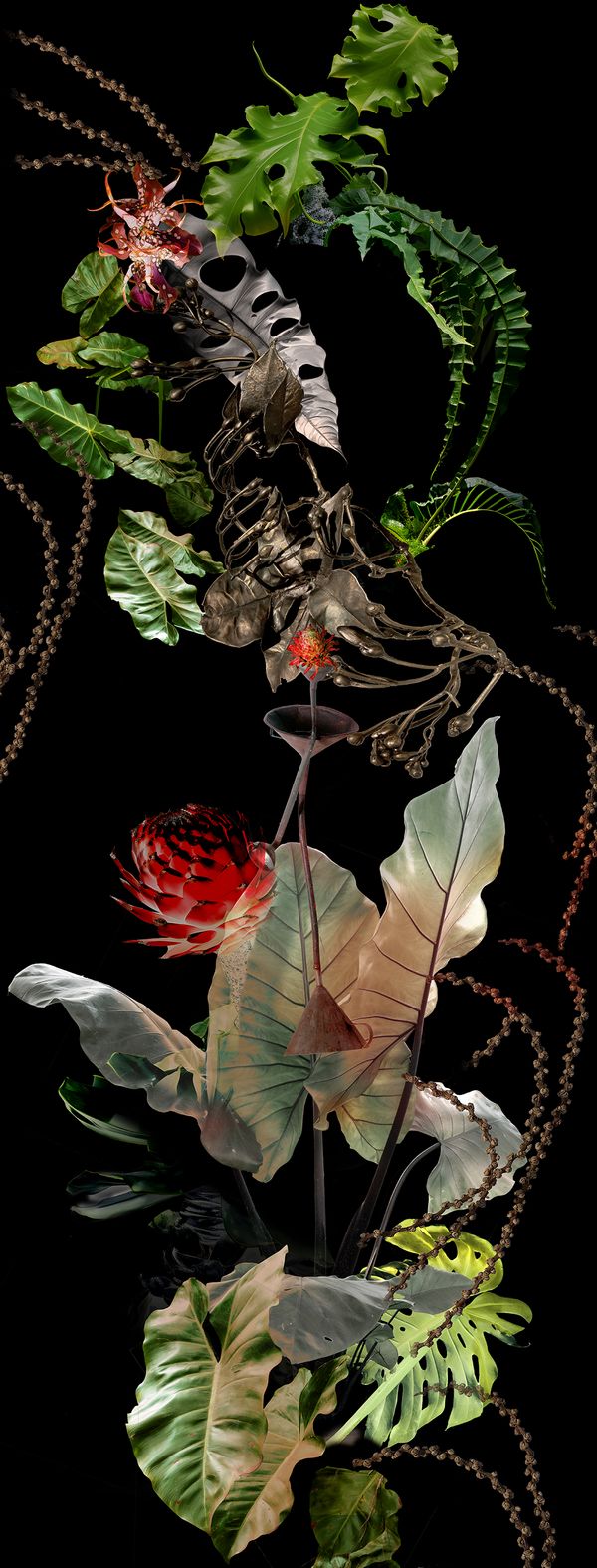 My interest in giant ferns—among the oldest living plant species, dating back over 330 million years—serves as a way to access deep time, anchoring the present in a continuous yet endangered natural history. The accompanying works incorporate real botanical fragments fossilized into metallic structures, evoking a tension between organic life and industrial materiality.