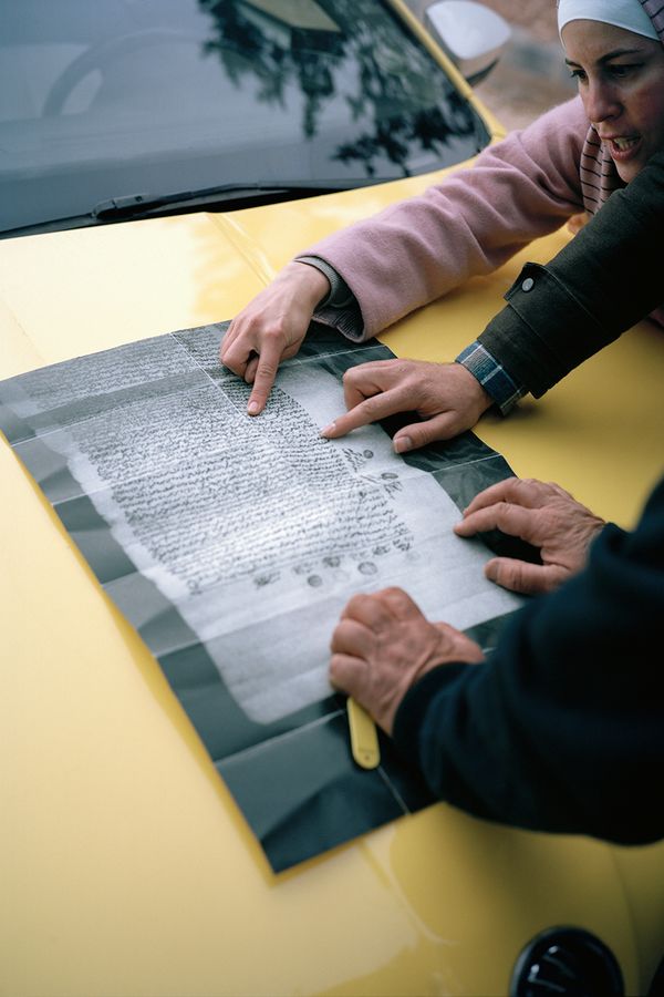 Confronting the testimony, the map and the topographical reality of borders became a priority for me in my documentary research. Both a map and proof of acquisition, the waqfiyya is then preciously transmitted through the family. As I was able to travel back and forth between Palestine and Jordan using my French passport, I took on the role of messenger throughout the project, bringing images back and forth between separated families. He takes me to the famous waqf lands on the outskirts of the city, which give the impression of derelict land. Hossam and his daughter Shahd help me understand what waqf means to them. On the Jordanian side, it represents the trace of a strong heritage, the proof of an origin so often undermined by the non-existence of a state. Here, it's not just a bequest or an inheritance, it's real proof of existence. Proof of legitimacy, proof of resistance. The boundaries of the land are fine-tuned and registered not only for traditional reasons, but also to preserve the land and its resources.