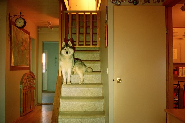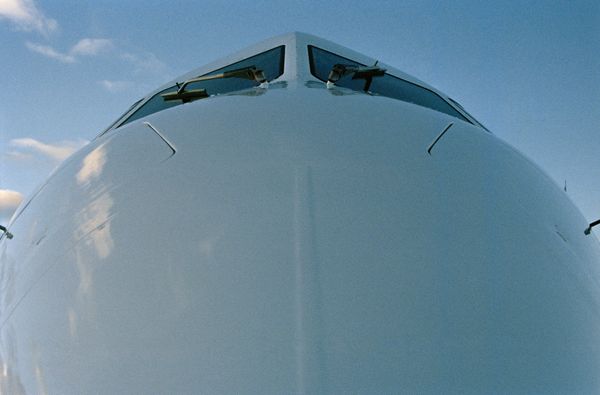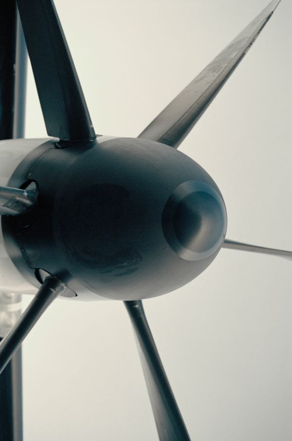Details of planes are enlarged and abstracted to feel almost corporeal: a turbine's tip shines the way a husky's nose appears lacquered at sunset. A blurred dog moving through a dog door becomes a threshold, an entry and an exit at once. Dog doors become a sort of boarding; gates shift between domestic and structured passage, between permission and restriction.