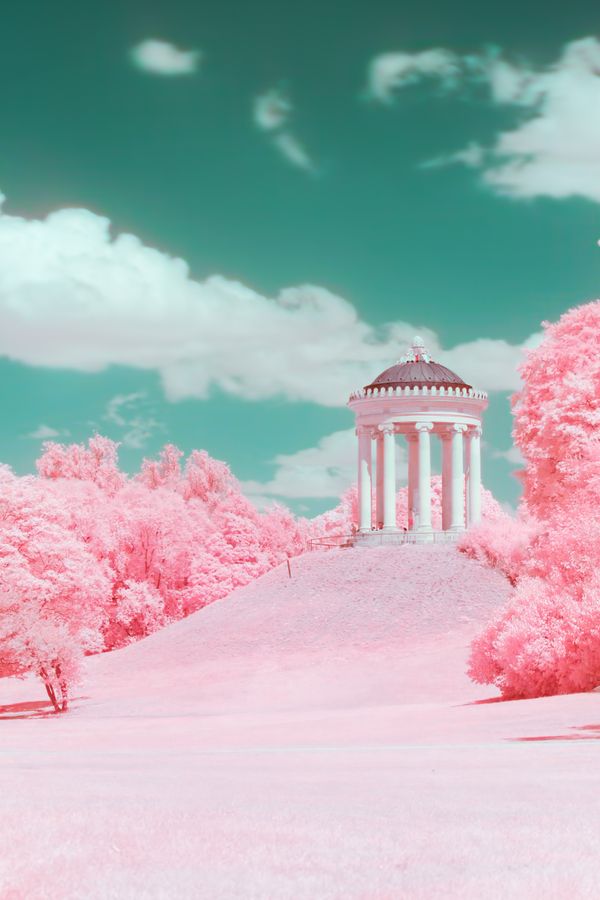 The English Garden in Munich is one of the largest urban parks in the world, a designed nature, a cultivated wilderness, a public space that performs naturalness. Shot in full daylight, the familiar geometry of its lawns, pathways, and classical structures remains intact. And yet everything has shifted. Foliage glows in luminous pinks and whites. The sky settles into cool, artificial tones. The Monopteros, that small Greek temple perched above the park, becomes something between a monument and a mirage.