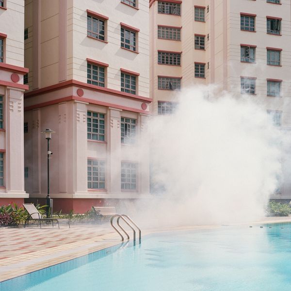 There is a moment of blindness; sitting by the edge of a chlorinated swimming pool—the whir of an engine echoes across the walls of surrounding buildings reverberating through the estate. My vision becomes momentarily shrouded by a plume of smoke which snakes through the surrounding curated foliage; while the scent of a gaseous cocktail of chemistry fills the air. The fog becomes a temporary sculpture - suspending within city spaces, transforming the visual landscape into one of a haunting dystopian environment; the familiar becomes abstracted beyond recognition.
