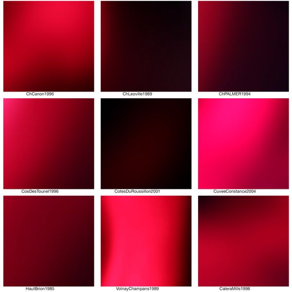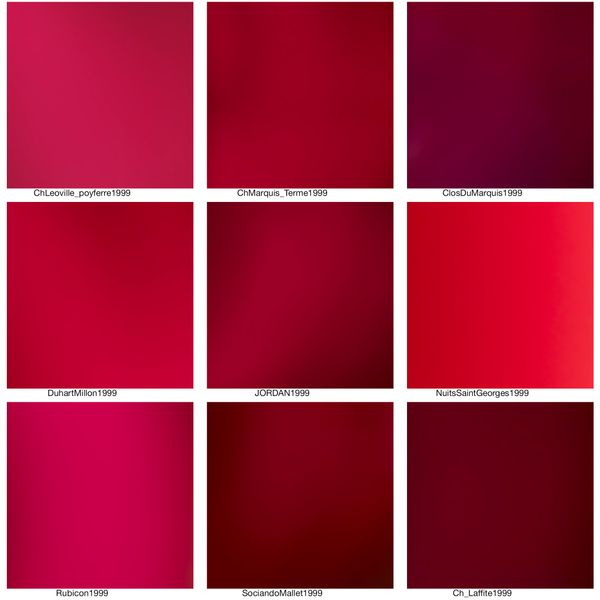 Appearing simply as gradations of red at a glance, these works comprise a contemplation of how simply one might be able to capture the beauty and diversity of wine in photograph - without the ability to record aroma or taste- and perhaps even more than that, how one might be able to visually express the various thoughts and feelings poured into each bottles.