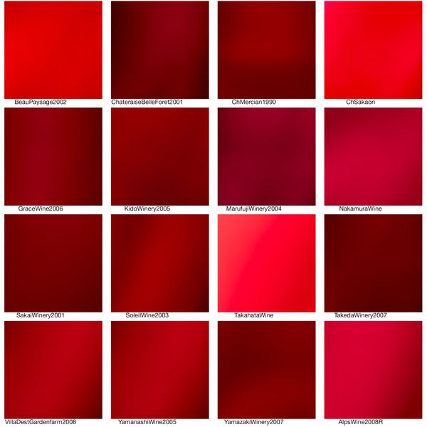 This gradation of red color contains the person's sense, the memory and the record of wine. I would like viewers to perceive the manifold thoughts which lay within the beauty and diversity of wines as well as within the varied “red” that are presented typologically.