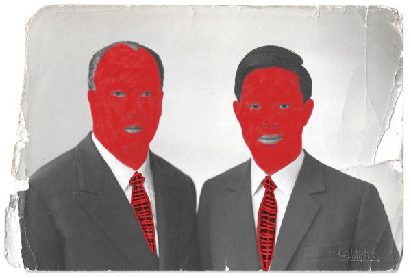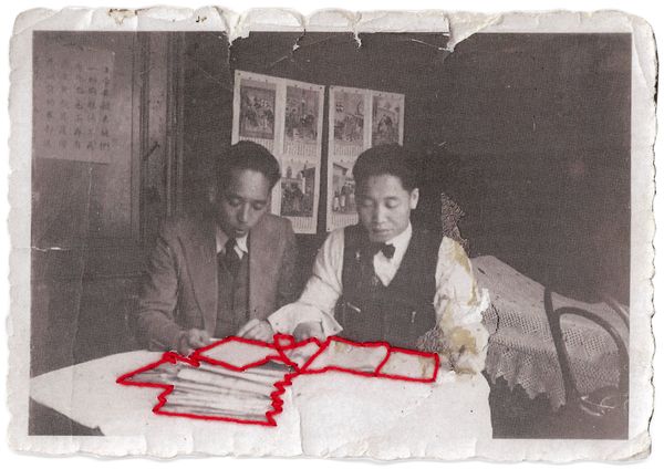 Some of the photographs feature unfamiliar faces which still leave me with questions. A few of the prints also have short messages or descriptions with names written on the back of them in various languages that I tried to decipher, but they did not clarify or explain much. I manipulate those images to represent this unknowingness, and the abstruse and ambiguous relationship I have with them, and those shown within them. I blur and obscure the subjects’ identities through partially cutting into them, adding Chinese red seal ink paste, and overlaying them to recreate a kind of double exposure.
